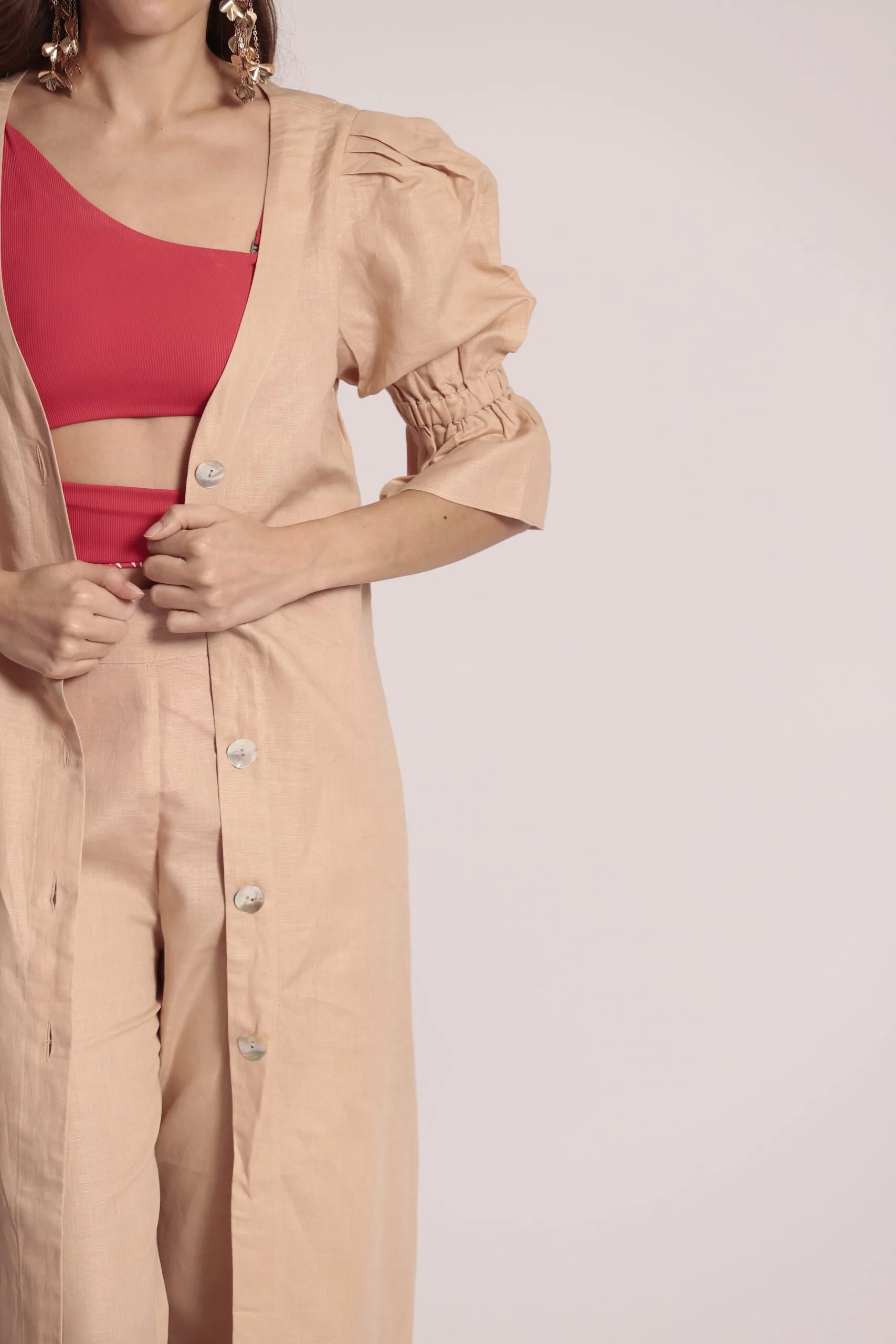 Kimono largo en lino con mangas globo. Su versatilidad permite ser usado como vestido también gracias a sus botones nacarados.