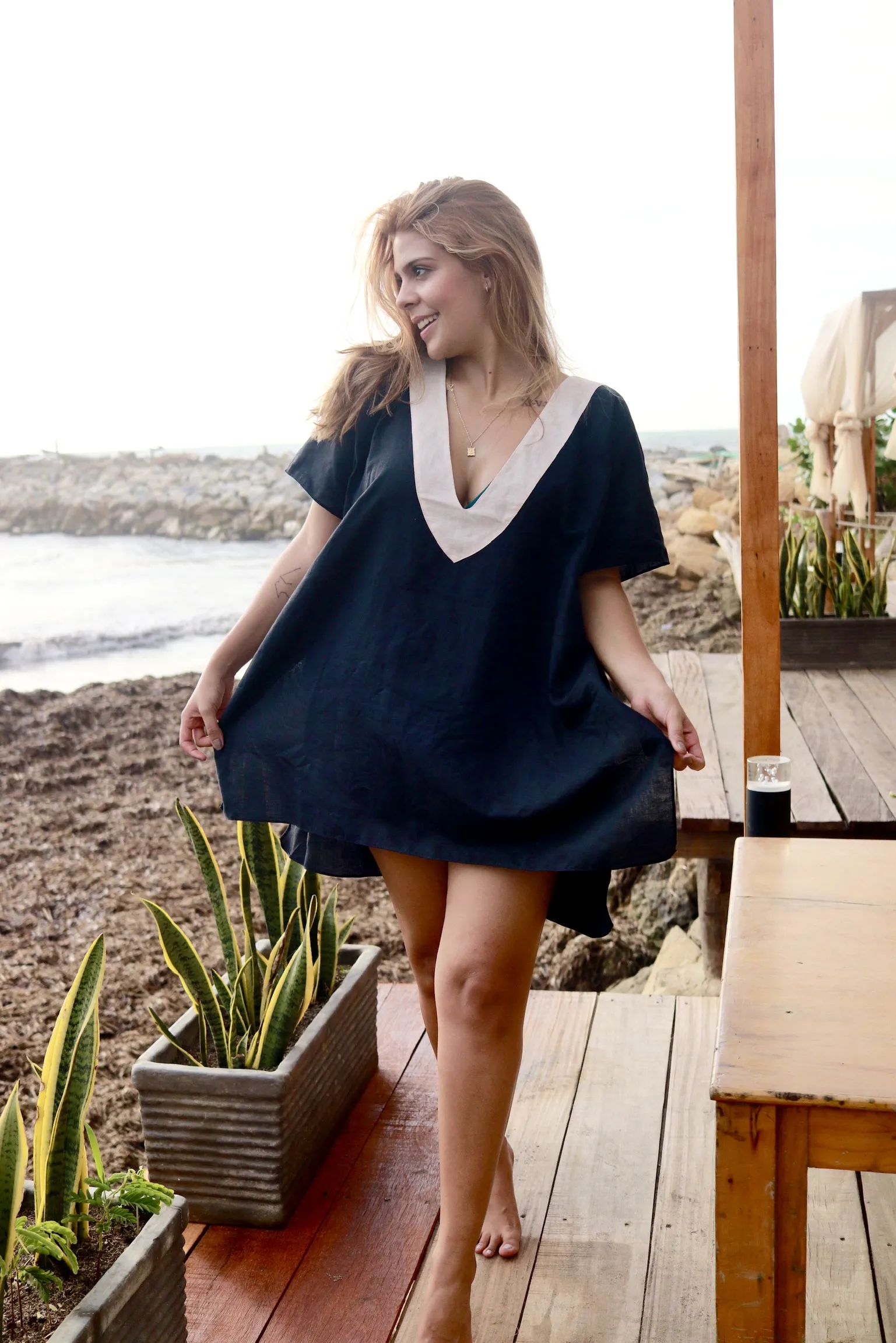 Blusón negro en lino con cuello en V de color light rosé.