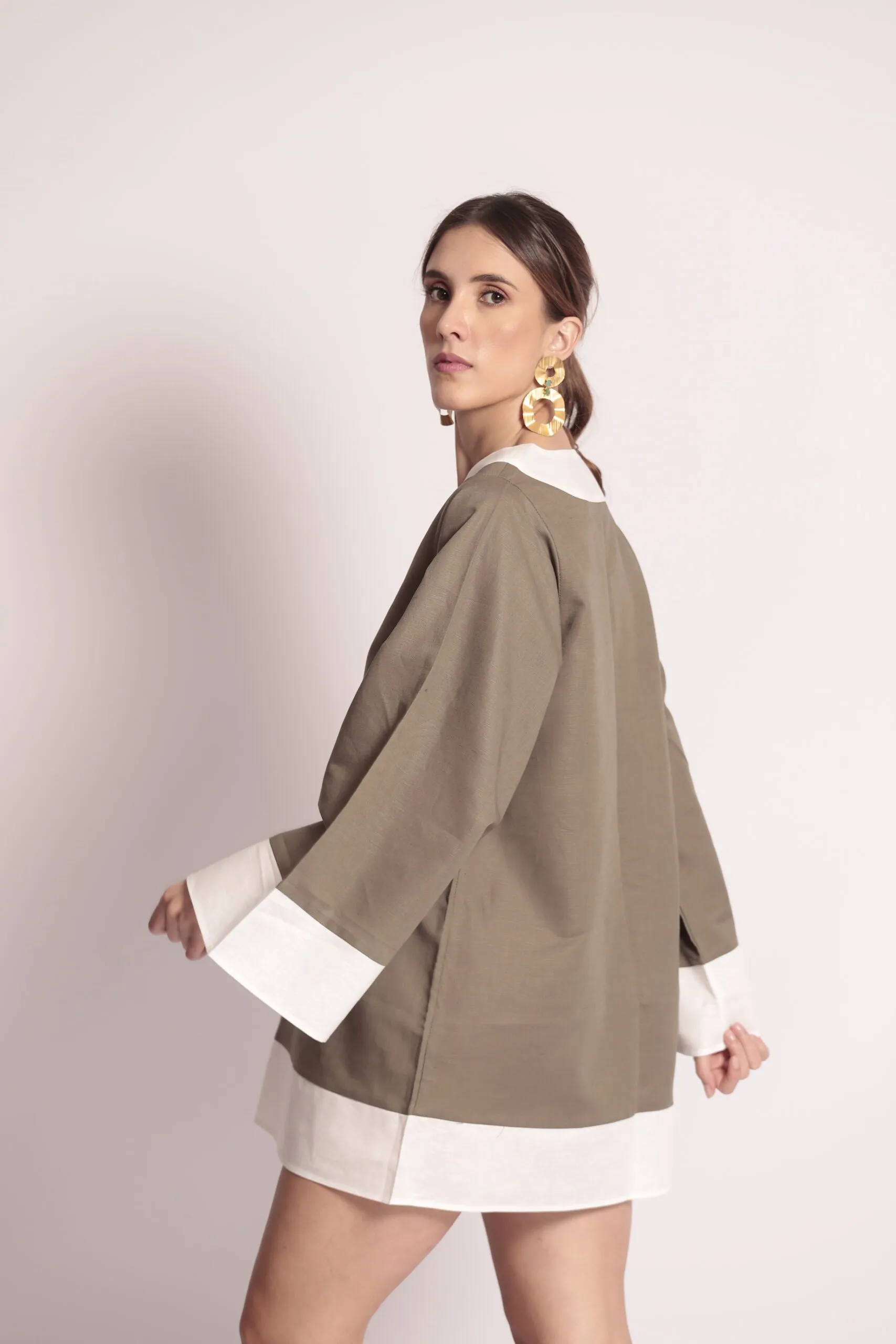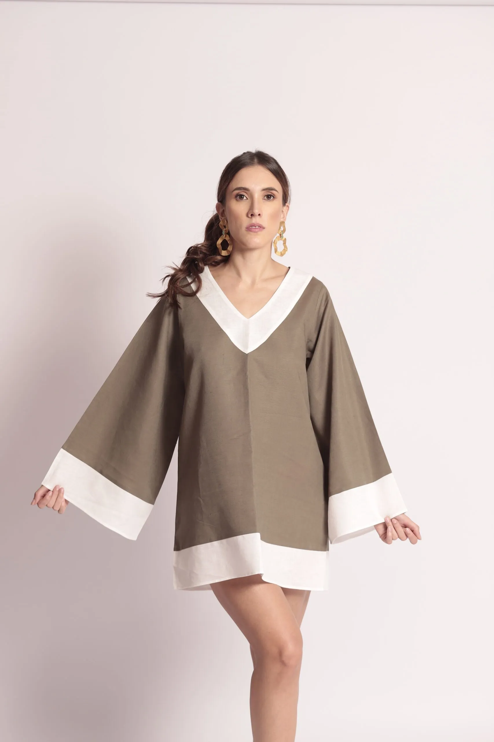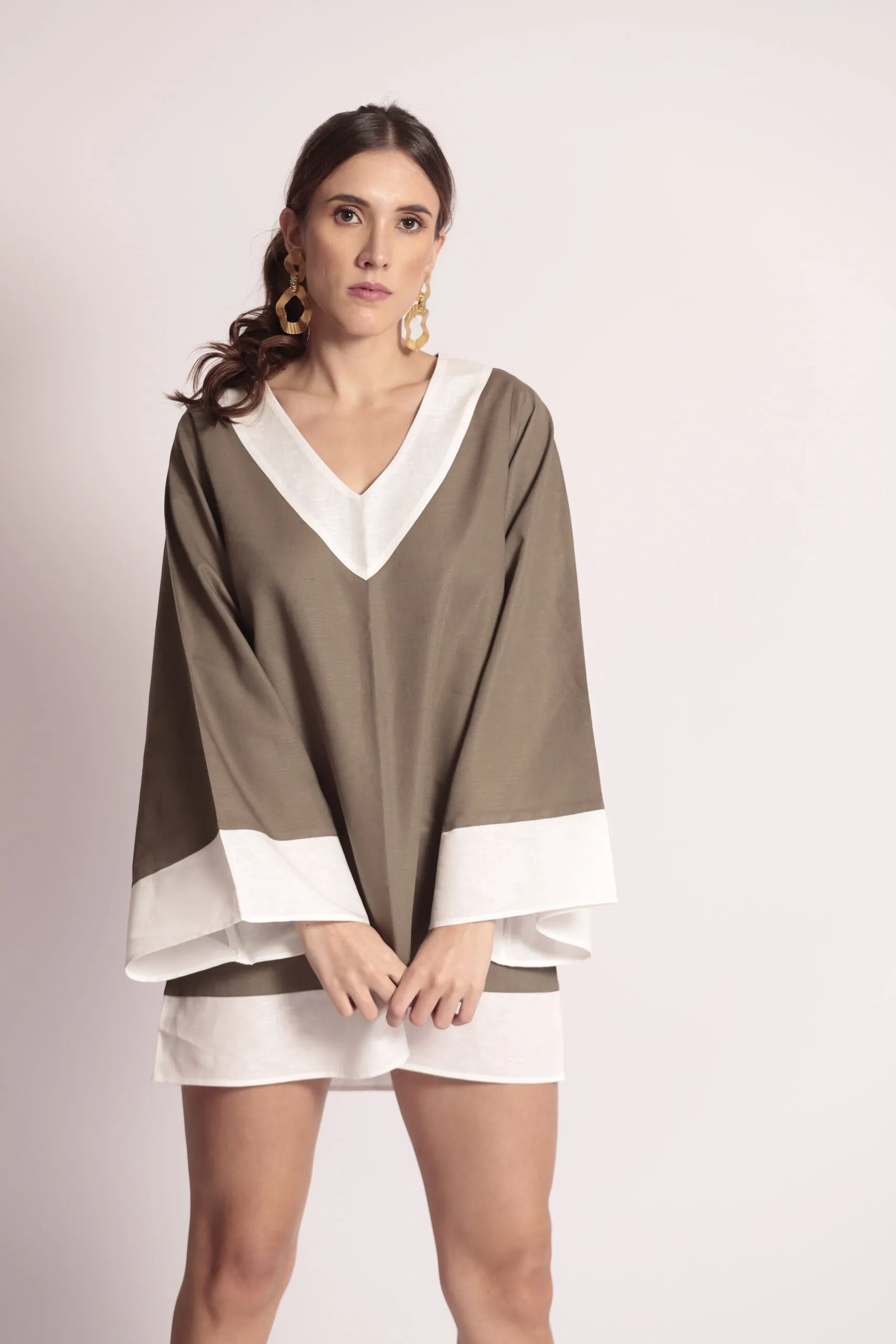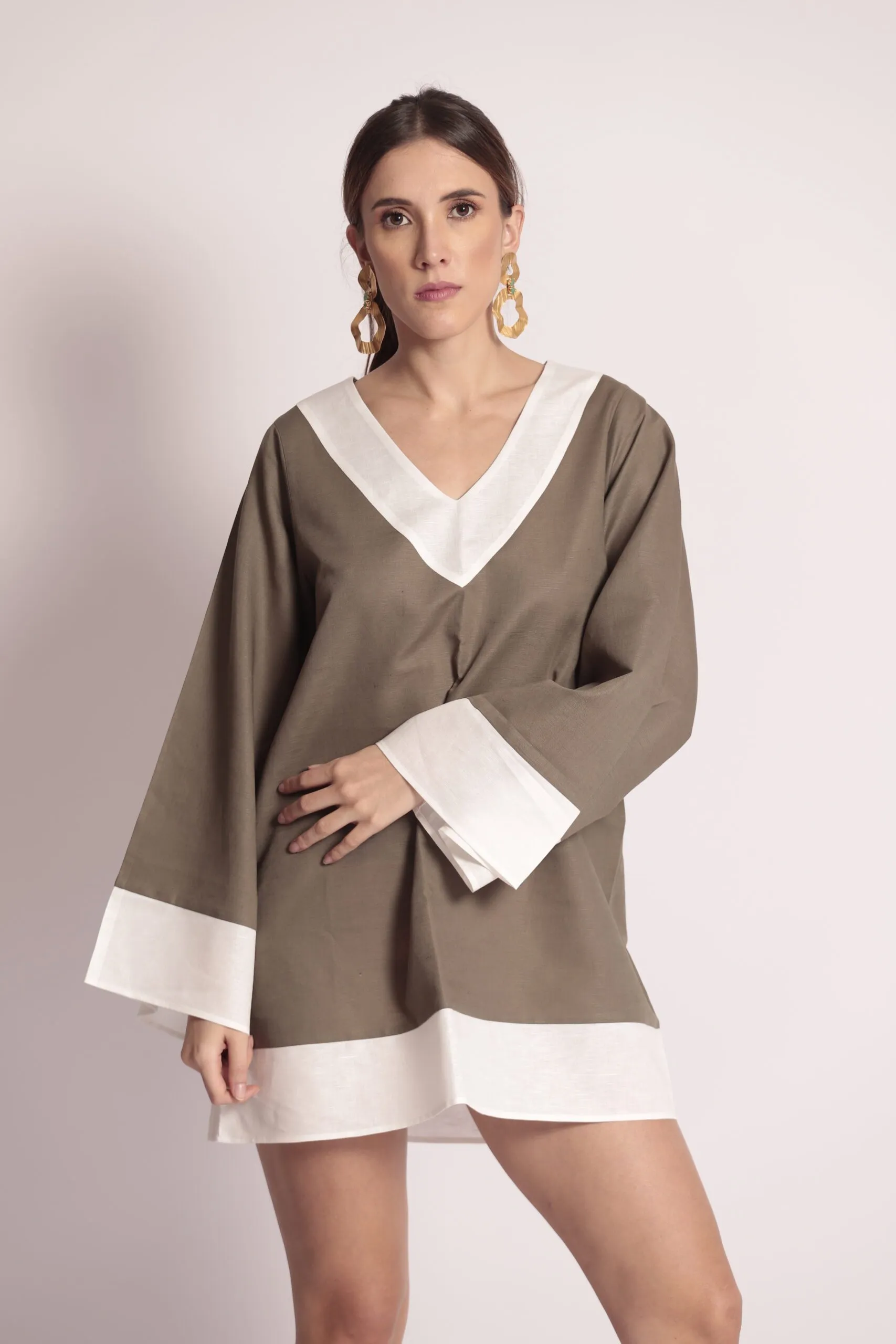 Blusón en lino verde oliva con extremidades (cuello y mangas) blancas.
