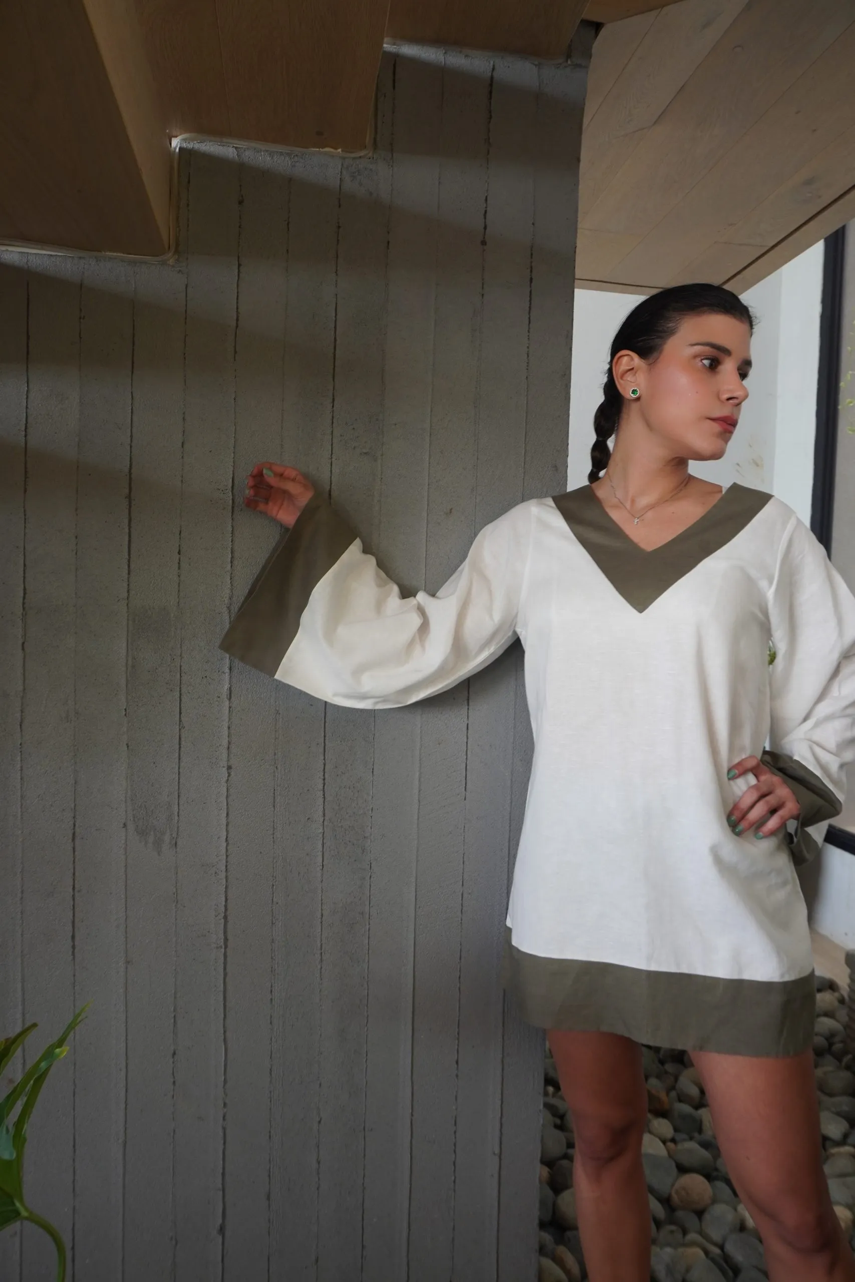 Blusón versátil blanco marfil con extremidades (cuello y mangas) verde oliva.